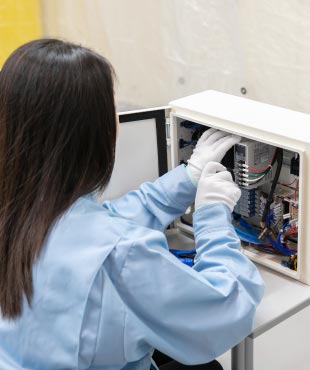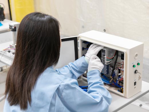 当社では、部品の発注・購入手配や、制御ボックスの組立、配線作業などに全ての従業員の力が大きく関わっています。事務作業だけでなく、設計図を見ながら配線するなど、専門的な業務もどなたでも行える職場です。ものづくりの根本から携わり、活躍できる環境を提供しています。